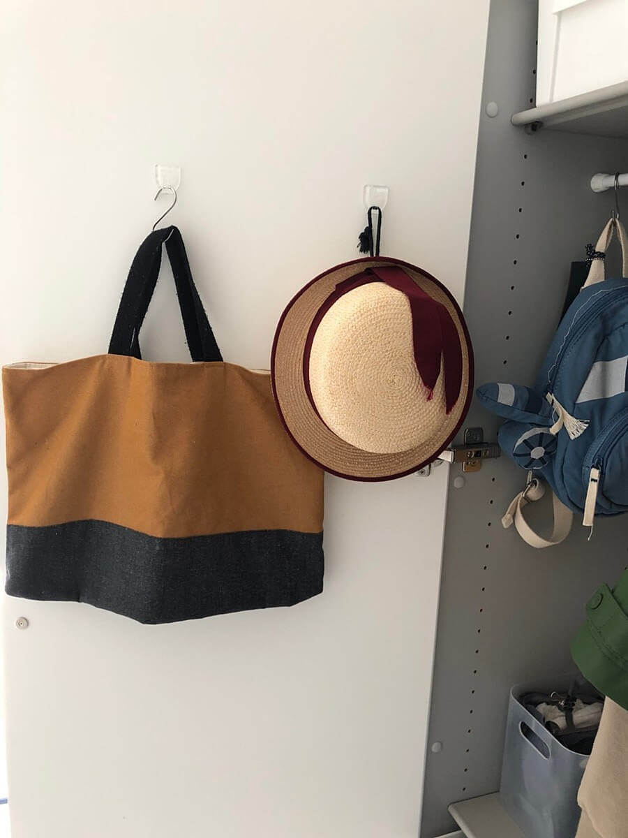 レッスンバッグや帽子は扉側に粘着フックを貼り付けて吊るしています。