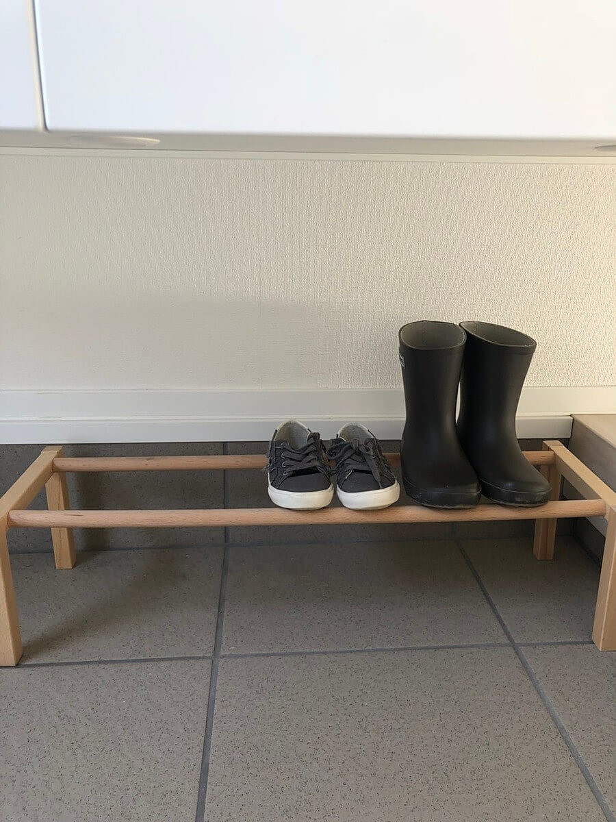 靴は子どもが自分でシューズウォールから出したりしまったりはまだ難しいため、シューズラックの上に置いています。