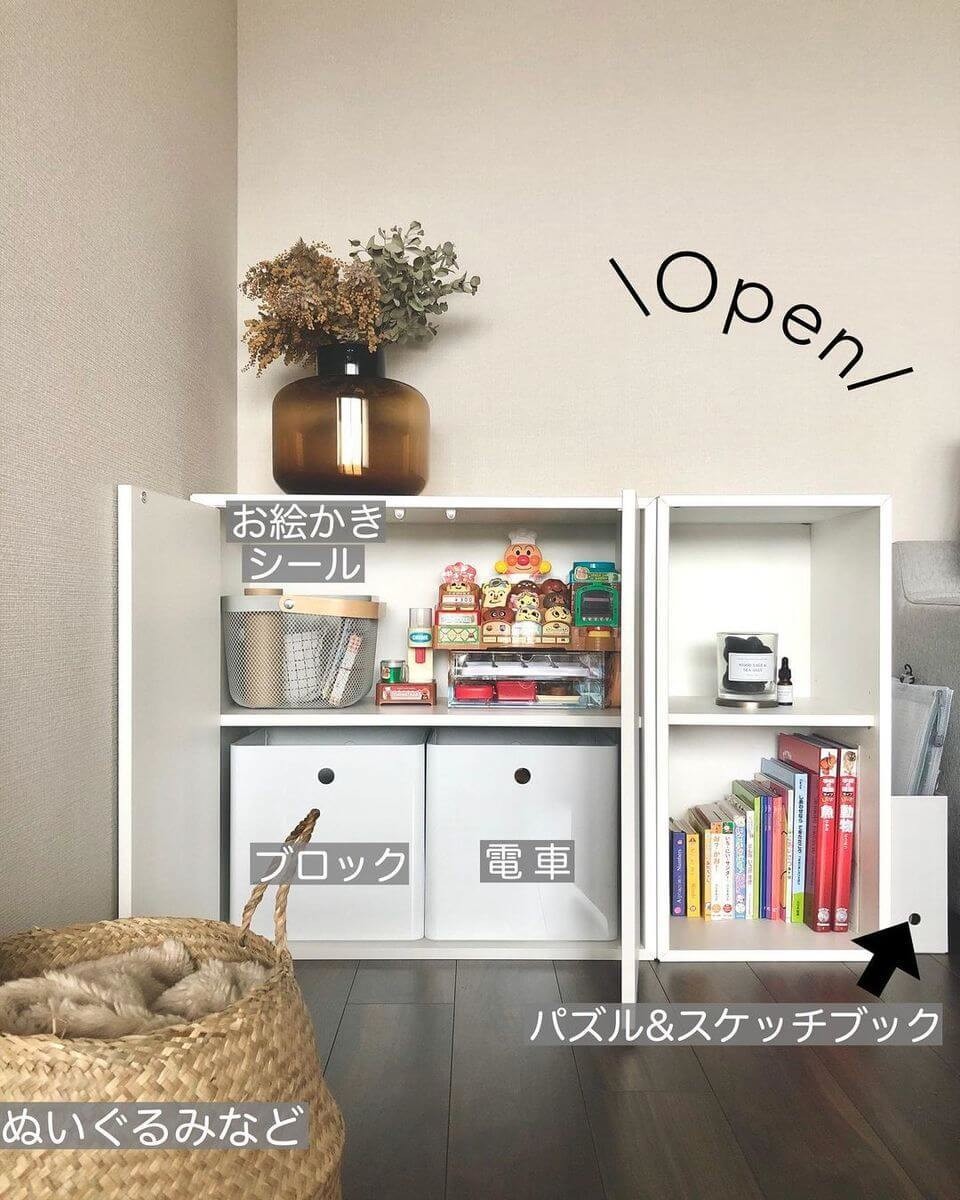 @syoko.t.homeさんは、イケアのカラックスシリーズをおもちゃ収納のラックとして活用。上段には白いボックスを入れて細々としたおもちゃを、下段は絵本やアルバムを収納しているそう。