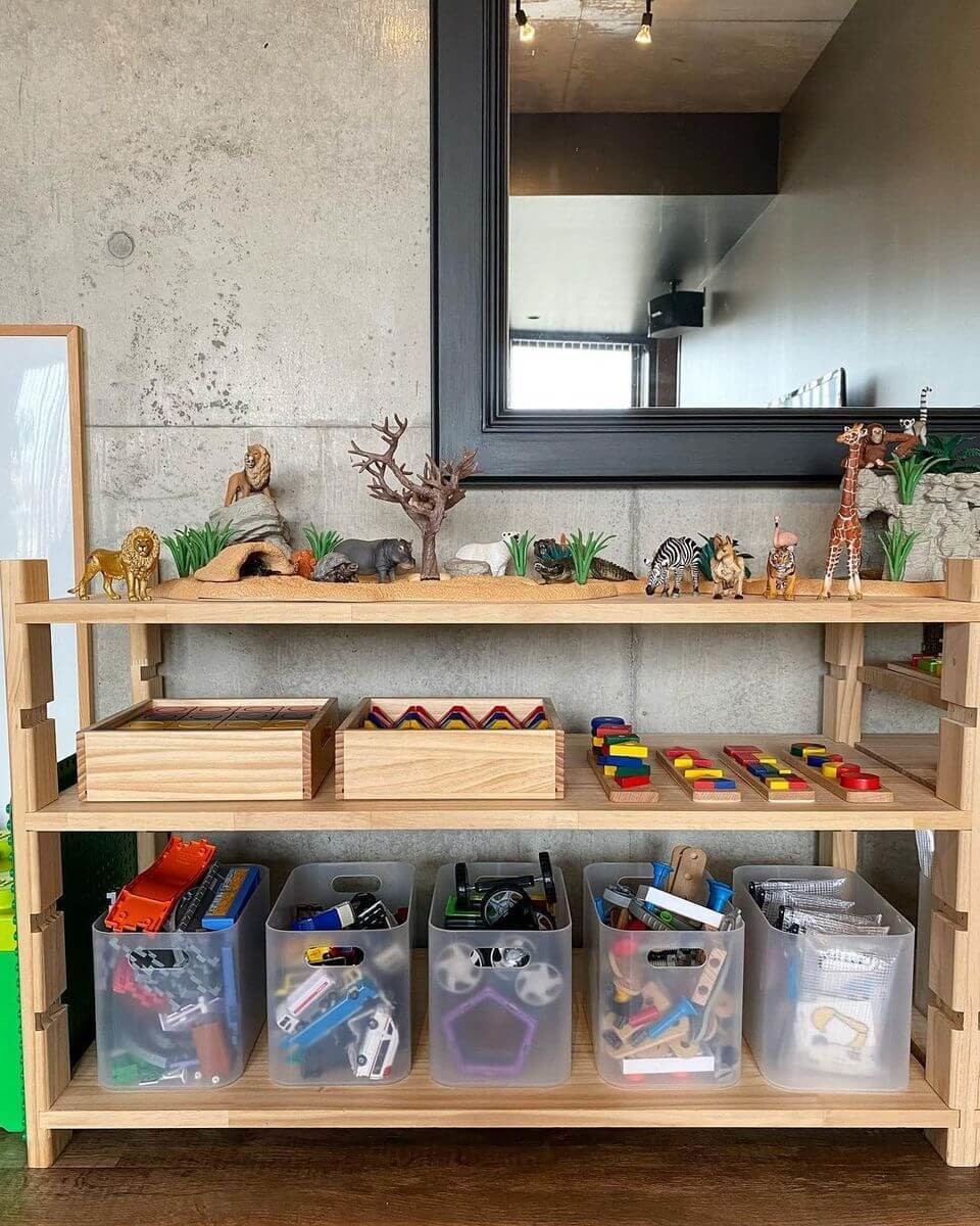 1つ1つのおもちゃが見やすく、所定の場所が決まるので子どもも大人も片付けしやすくなりますね!