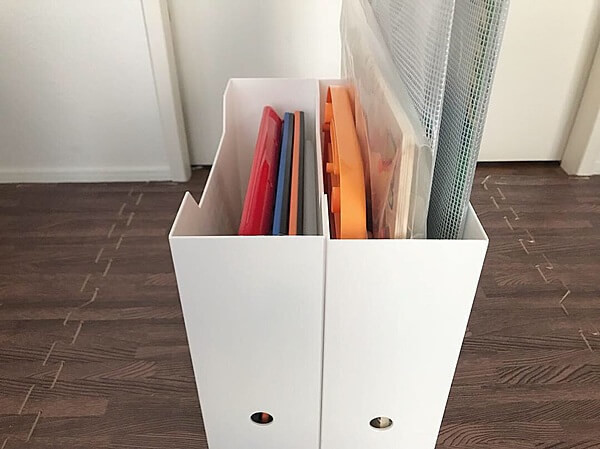 そんな事態を防ぐには、100均のファイルケースにパズルを入れて、ファイルボックスに立てて収納しておくと、スッキリ綺麗です!