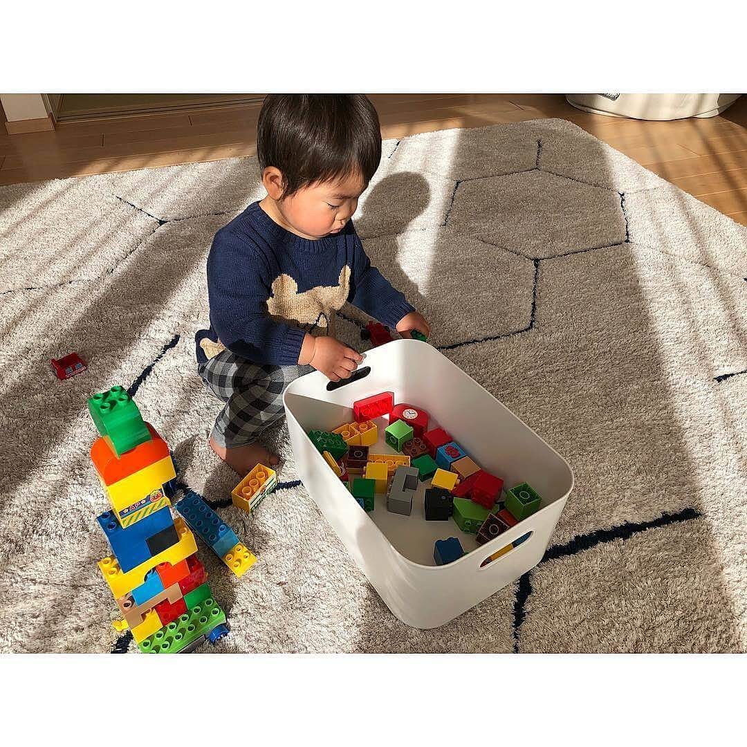 こちらは、イケアのクナッグリグを活用したおもちゃ収納!可愛いデザインで、重ねて入れることができるので種類ごとに整理できますね。