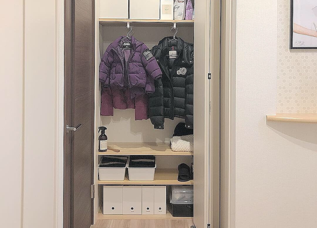 よく着るものだけを玄関に掛けて、他の上着は2階のクローゼットに収納しています。