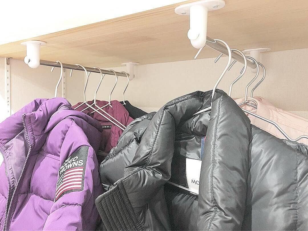奥行の狭い収納で、大人の上着の肩幅だと扉に当たってしまうので、縦に2本設置しました。