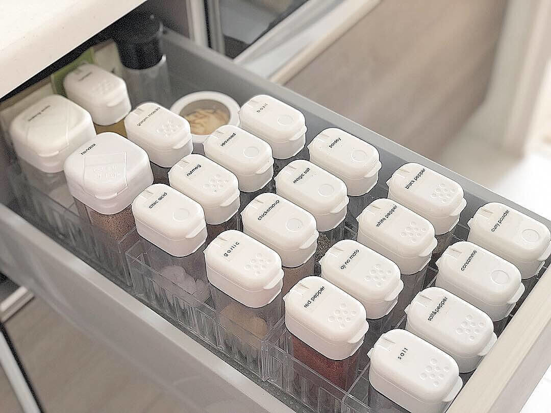 ごちゃごちゃしがちな多種多様のスパイスや調味料を詰め替えて、お気に入りの字体でラベリング! 出し口の形は2種類あるので、中身によって変えています。