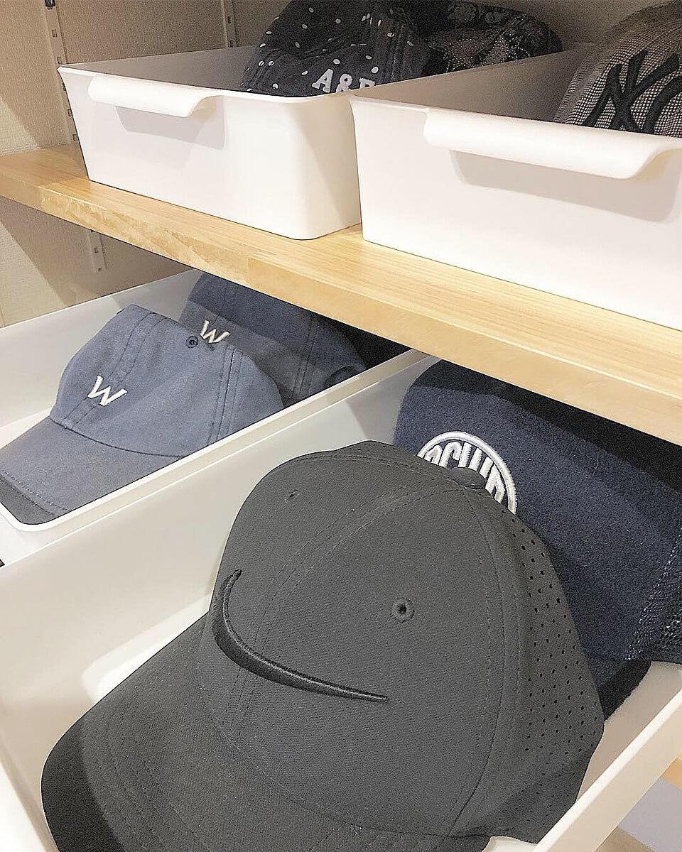 トレーを引き出し式に使い、玄関にキャップをまとめています。 出出かける時に必要な鍵、サングラスや、印鑑などもこのトレーに収納。