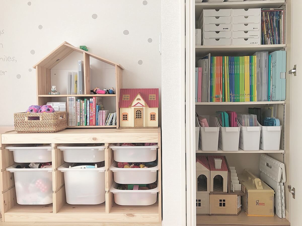 おもちゃ収納のクローゼットの中に置き、細かく分類して子どもたちもしまいやすく見つけやすいようにしています。
