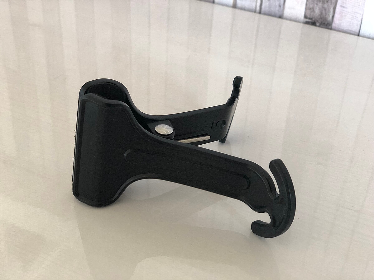 ツマミ部分の先端がフック形状になっていて、ここに買い物袋やバッグなど、フープがあるものがかけられる仕組みになっています。