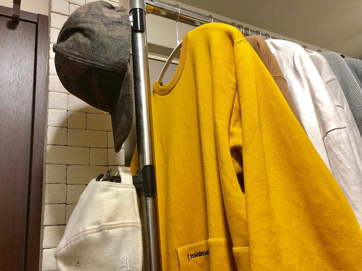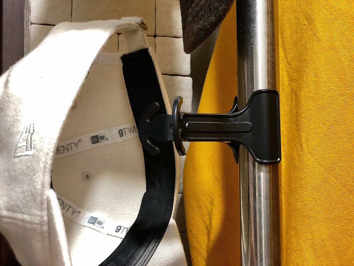 こちらはクローゼットのポール部分にクリップを挟んで帽子を掛ける収納にしています。 帽子の大きさにより簡単に位置調整もできるので、便利です。