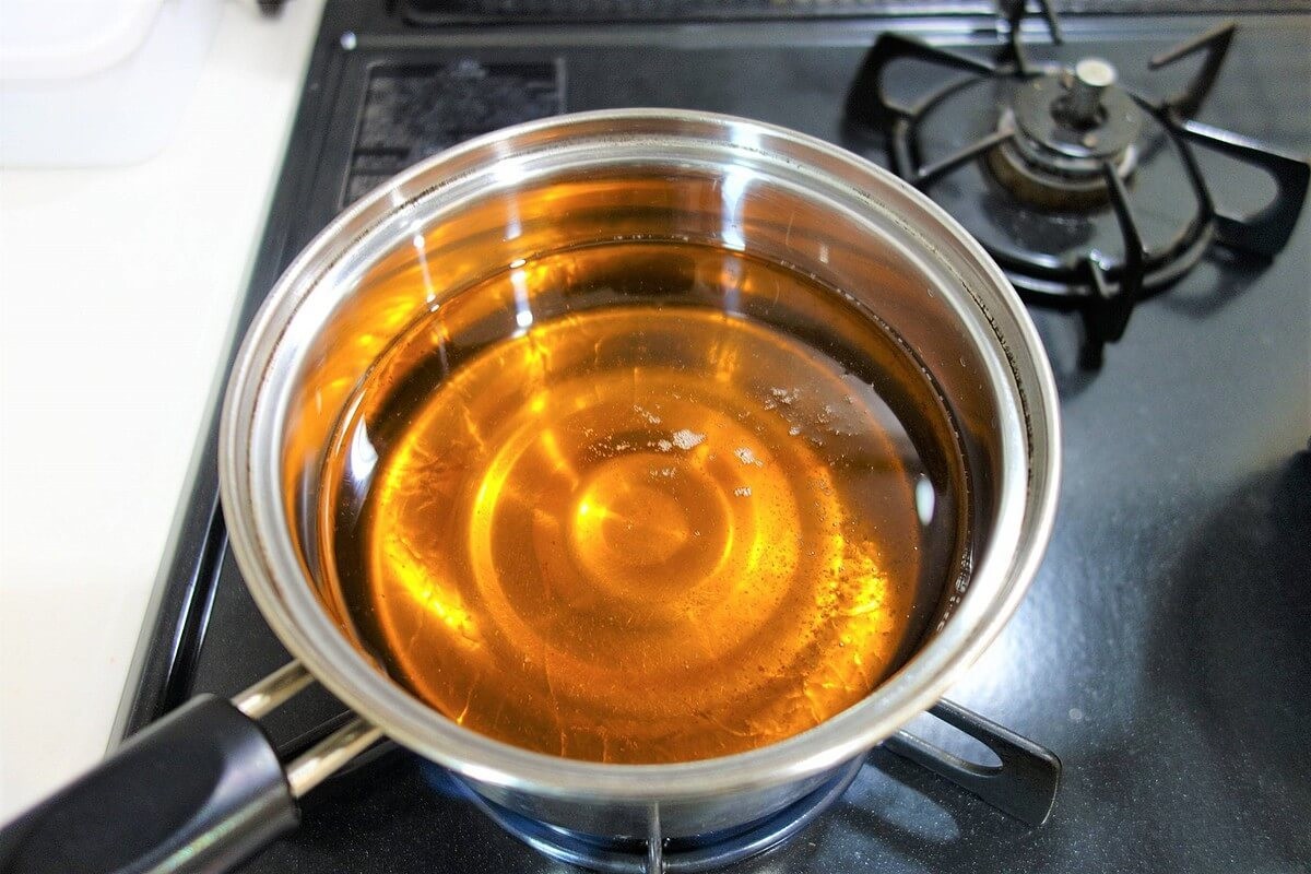 続いて、火をかけて油を温めます。油の温度は90度以上あればOKです。