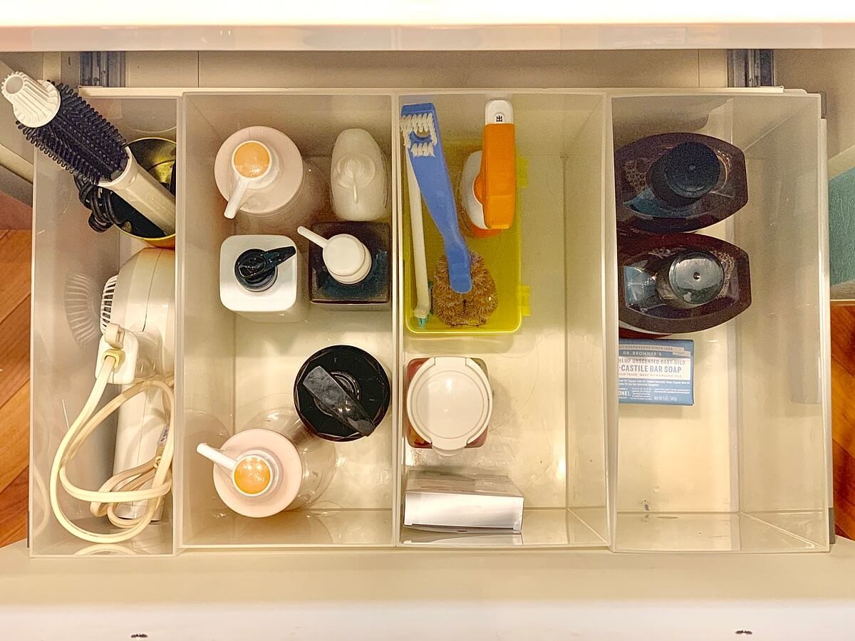 洗面台下の引き出し収納に、無印良品のファイルボックスを並べてドライヤーを収納している例です。