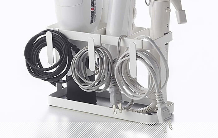 こちらは、ドライヤーだけではなくヘアアイロンも一緒に収納したいという人におすすめのアイテム。このまま置いて使うことはもちろん、付属のフックで洗面台の扉にかけて使うこともできます。