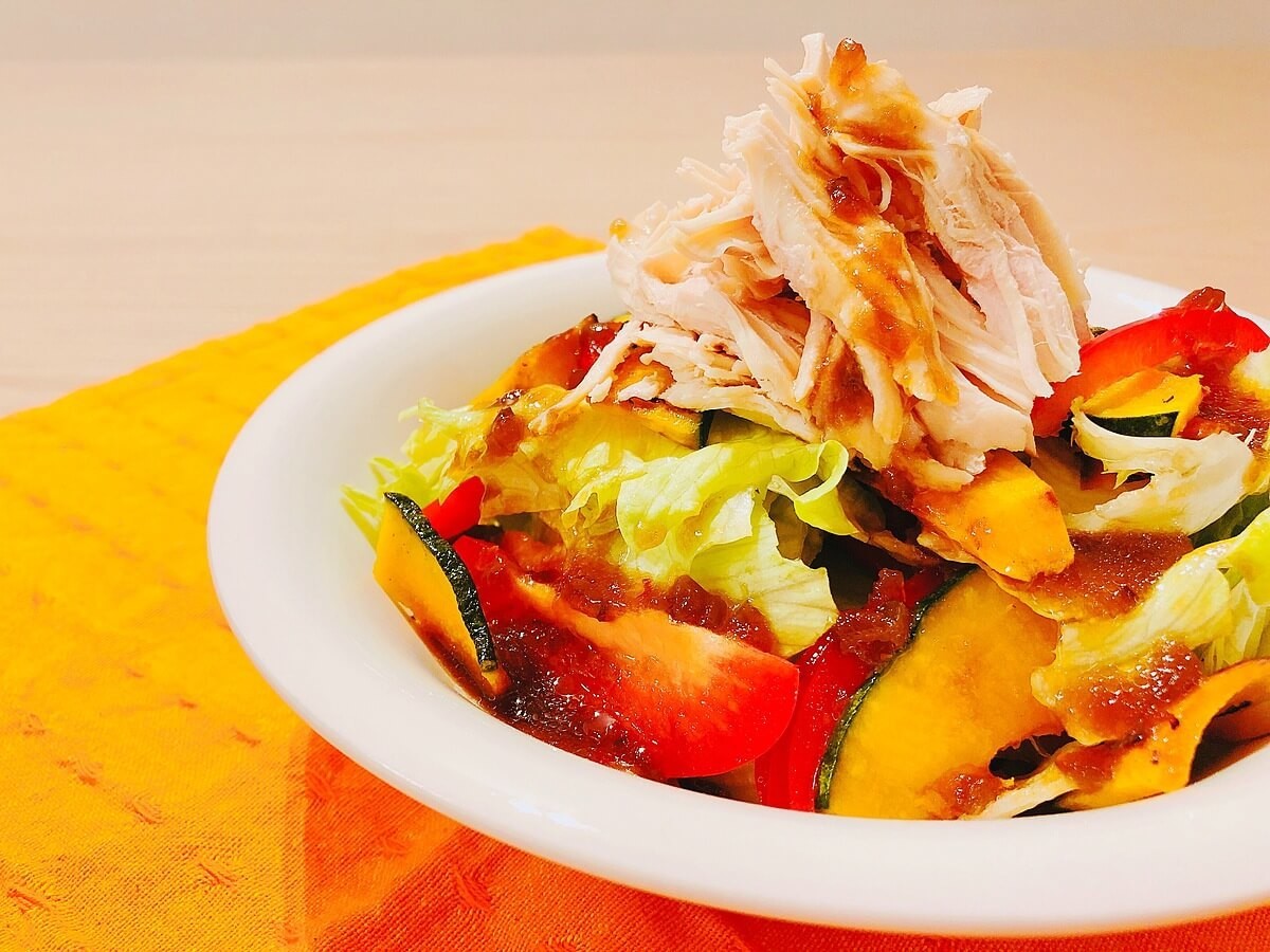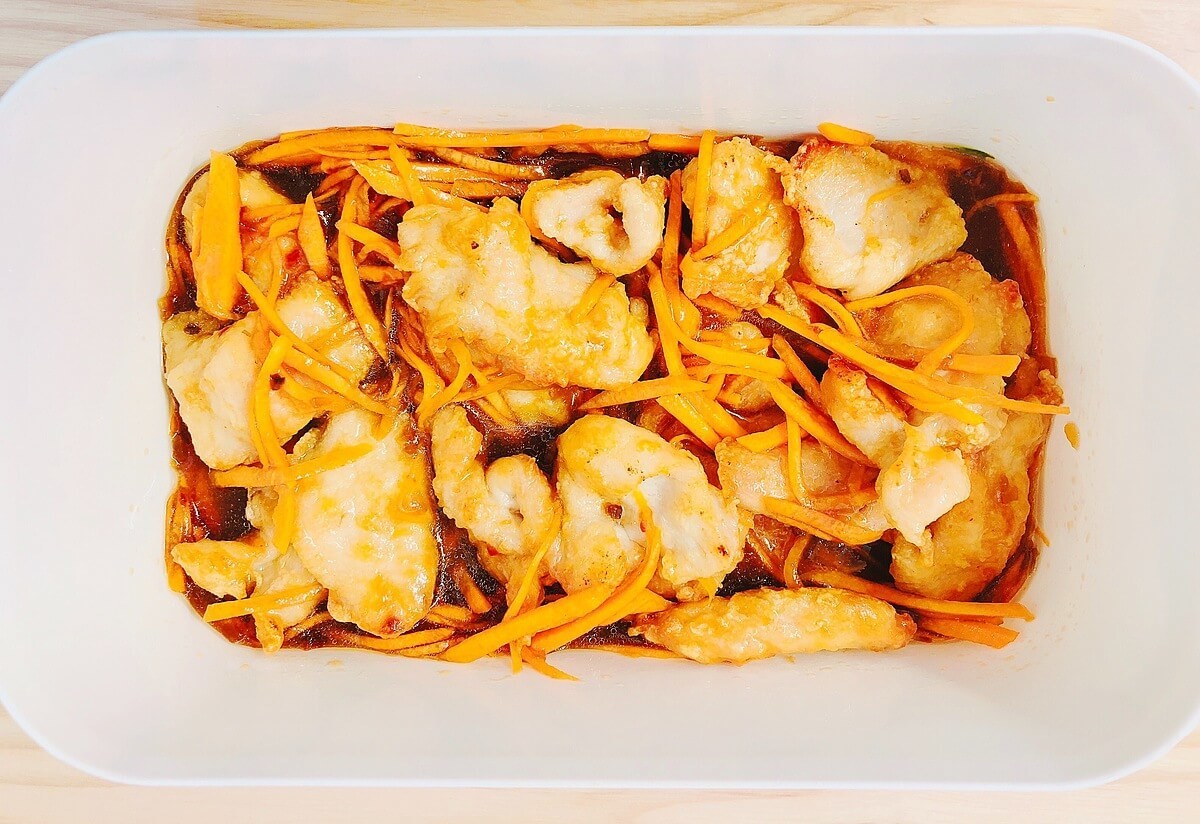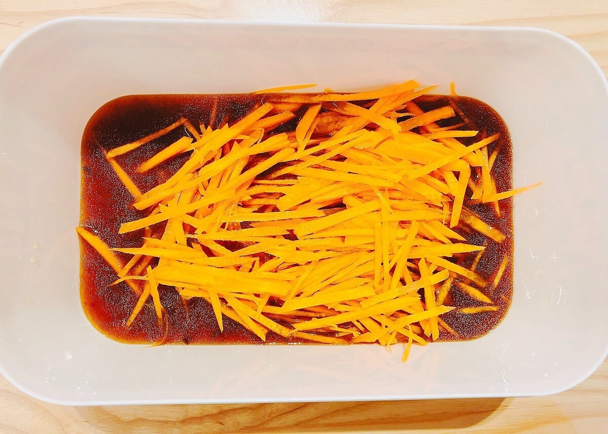 熱々の鶏胸肉をそのままマリネ液の中に入れることで、にんじんにも火が通って味もしみ込みやすくなります。時間がある時に鶏胸肉を焼いて漬けておけばすぐに食卓に出すことができるので忙しい夕食にもオススメです。