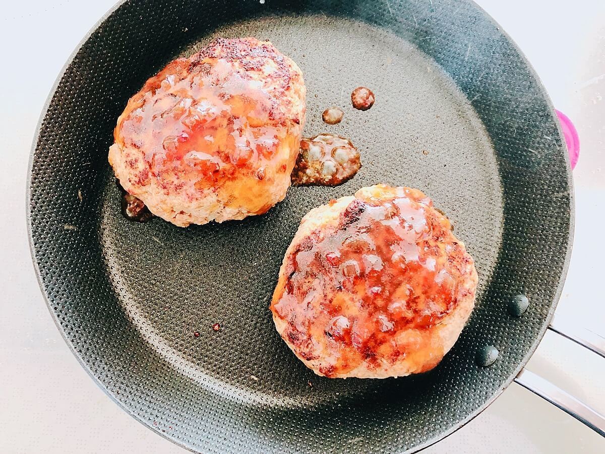 ハンバーグは多めに作って冷凍させているので、解凍してフライパンで和風たまねぎドレッシングをなじませるだけでしっかりとした味のハンバーガーになります。