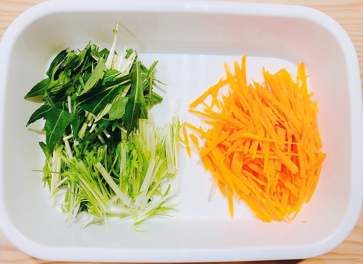 ② にんじんは千切り、水菜は食べやすい長さに切っておきます。