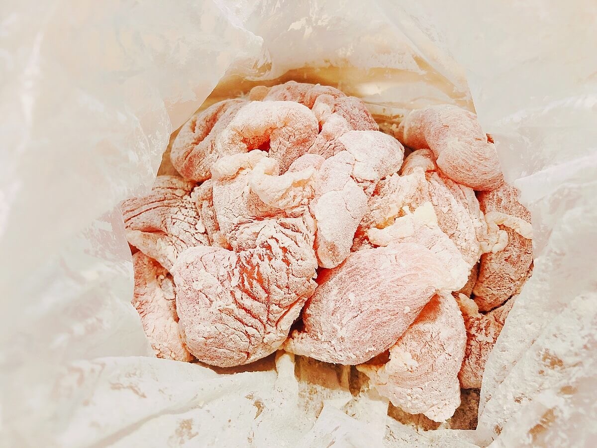 ① 鶏胸肉は削ぎ切りにして食品用のビニール袋に塩・砂糖と一緒に入れ、よくもみ込んでおきます(30分~1日程度)。