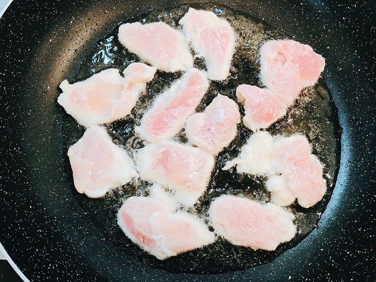 ⑤ フライパンに少し多めの油を入れ、鶏胸肉を揚げ焼きにします。