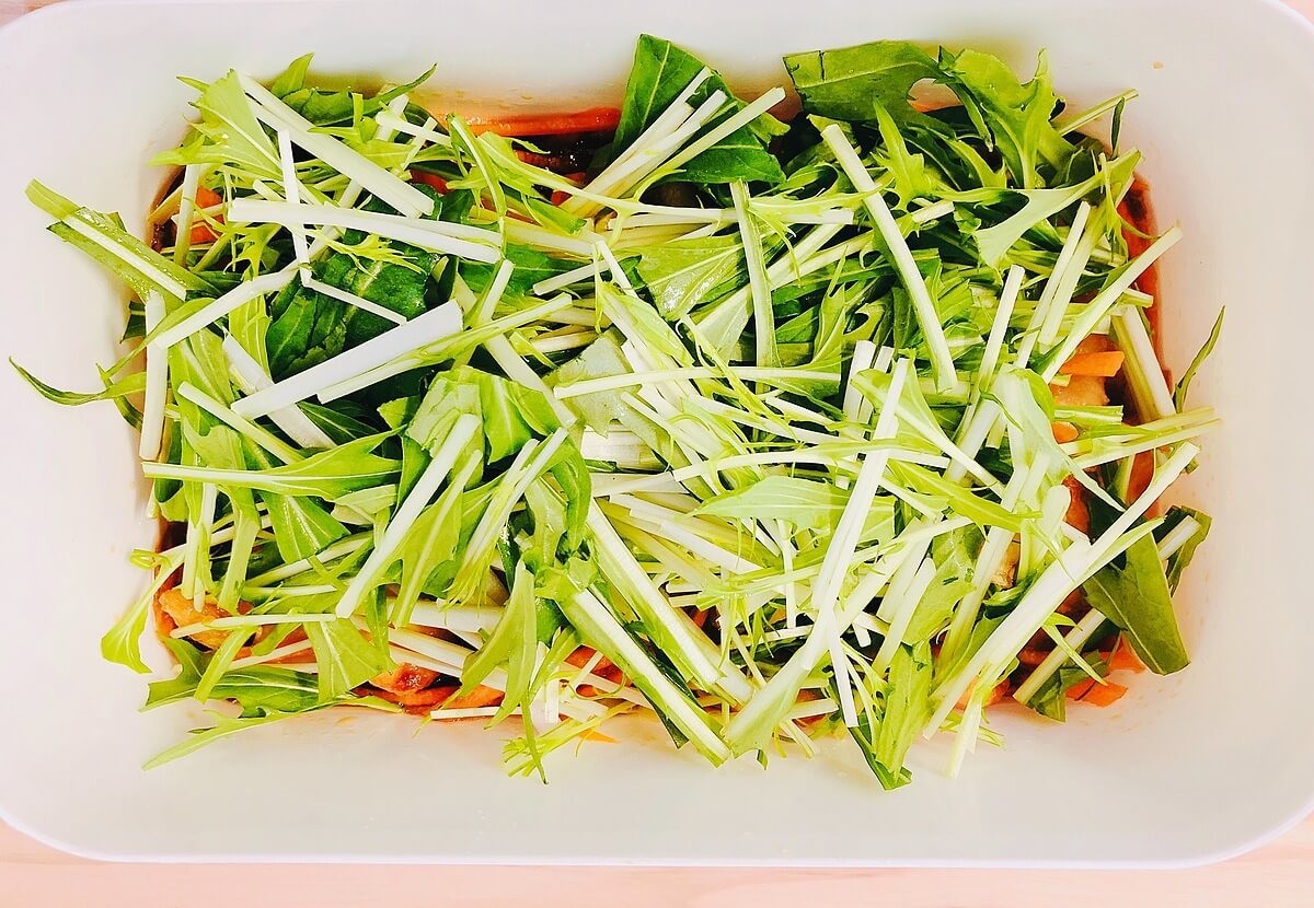 ⑦ 上から水菜を乗せて冷蔵庫に入れて味をしみ込ませます(目安は30分以上)。