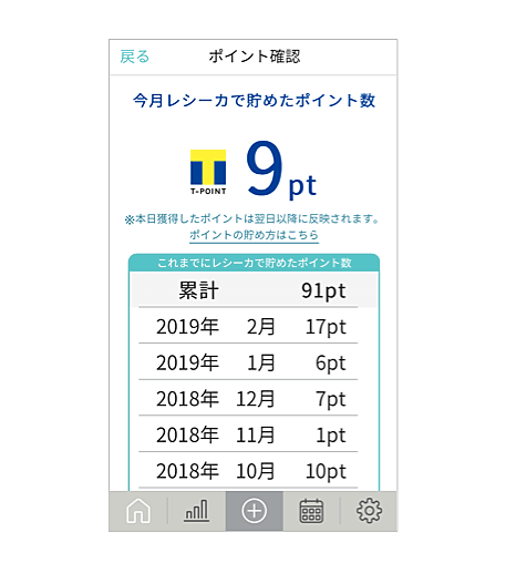 撮影したレシート情報を確認。手入力での登録も可能です。毎月の登録日数に応じて、ボーナスポイントもたまります。