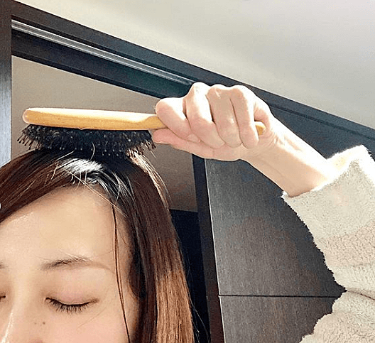 @mikakoさんの髪のお悩みは、乾燥しがちで絡みやすい髪質。さらに、クレンジング不足で髪のうねりも気になることから、パサついた髪をほどき、地肌にもやさしい“豚毛のブラシ”を使っています。