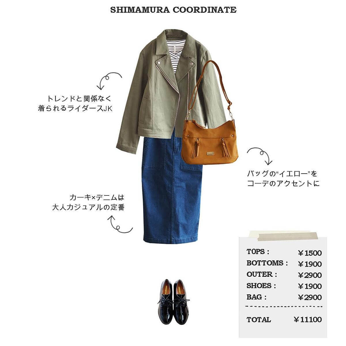 カーキとデニム、どちらとも相性の良い“マスタードイエロー”をコーデのアクセントにしました。