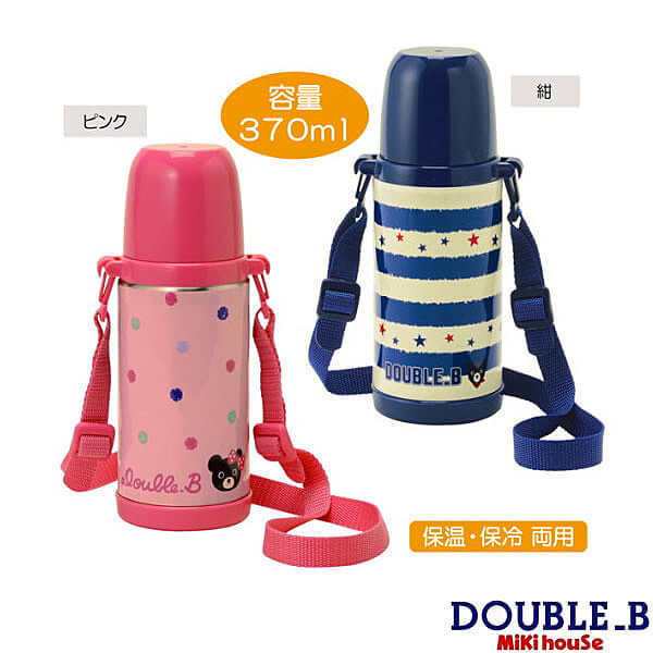 ミキハウスのステンレス製水筒は、容量370mlと子どもでもラクラク持ち運べるコンパクト設計。 ピンクのドット柄デザイン、ブルーのボーダーデザインは、ミキハウスならではの子どもらしいかわいさが特徴的です。