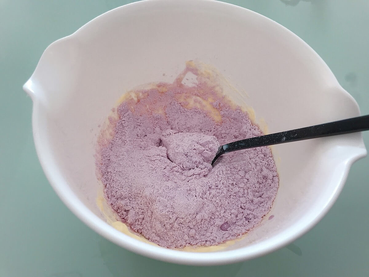ミックス粉にバターと牛乳を加え混ぜていきます。春らしい色でテンションが上がります♪