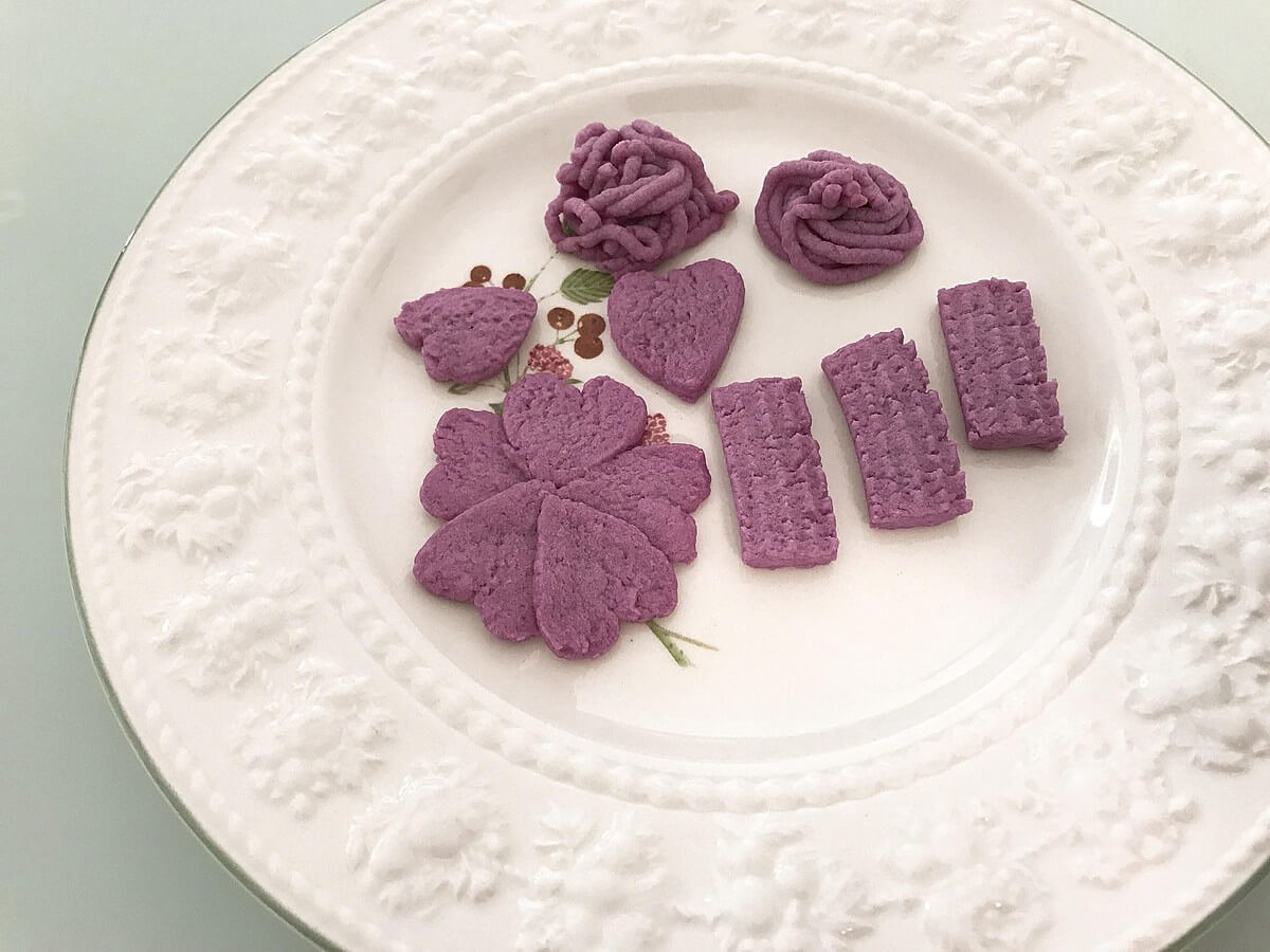 ハートは金太郎飴のように切って5枚重ねて桜のようにしてみました。線状のものは適当にくしゅくしゅっと整え、シマ状のものは適当に切って焼きました。1時間もかからず完成で子どもも大喜びでしたよ。星の絞り口も付いているのでチュロスなんかにも良さそうです。