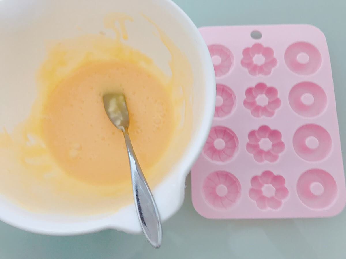 混ぜたらシリコンモールドに流し込みますが、型に軽くバターを塗っておくと取り出す際にスムーズにいくと思います。