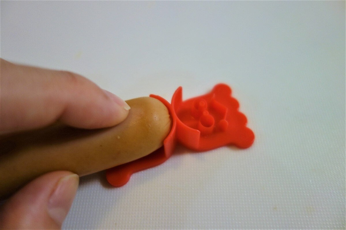 顔型は、このようにウィンナーを寝かせてカッターに押し当てて使います。