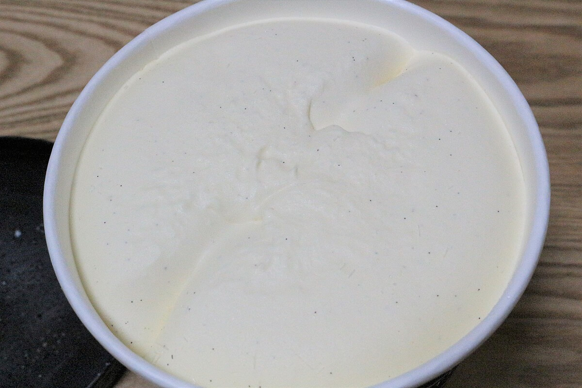 一方のニュージーランド産の濃厚ミルクのバニラ。 1リットル容器から器に取り分けているので、アイスが溶けてきましたが、なめらかでバニラの濃厚さはあります。