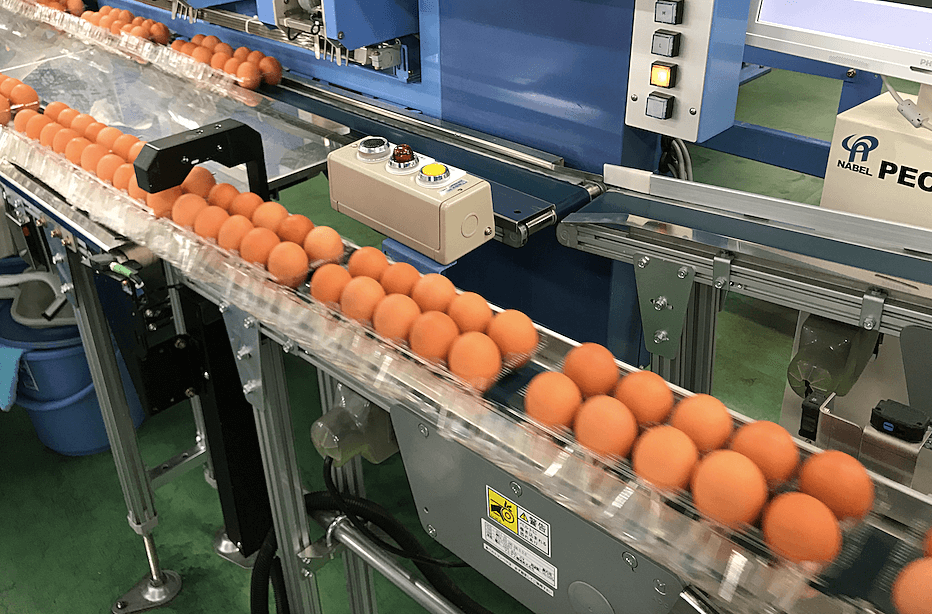 卵が到着すると、洗卵を行い、厳格な検品を経てパック詰めのコンベアに乗る流れです。