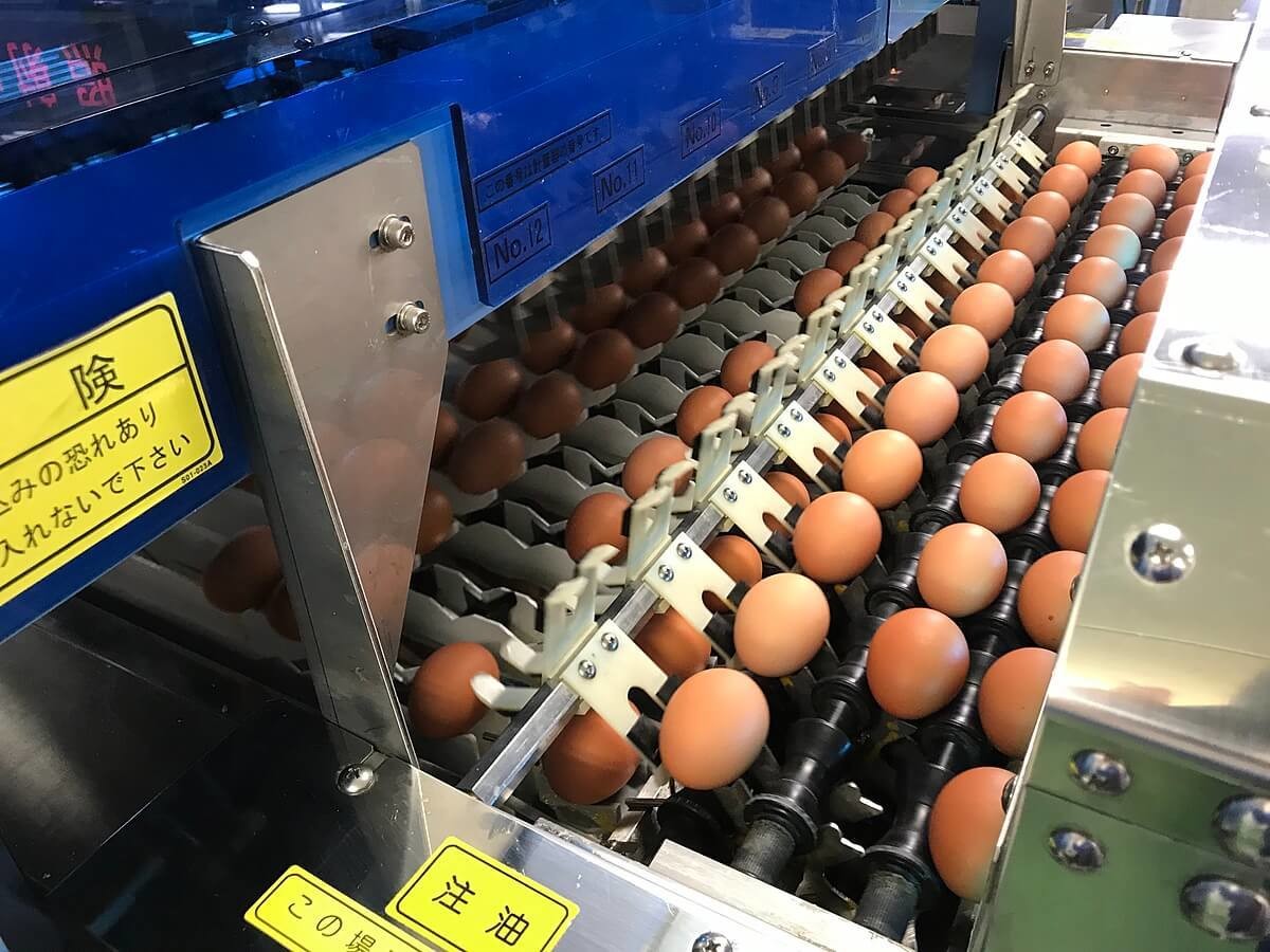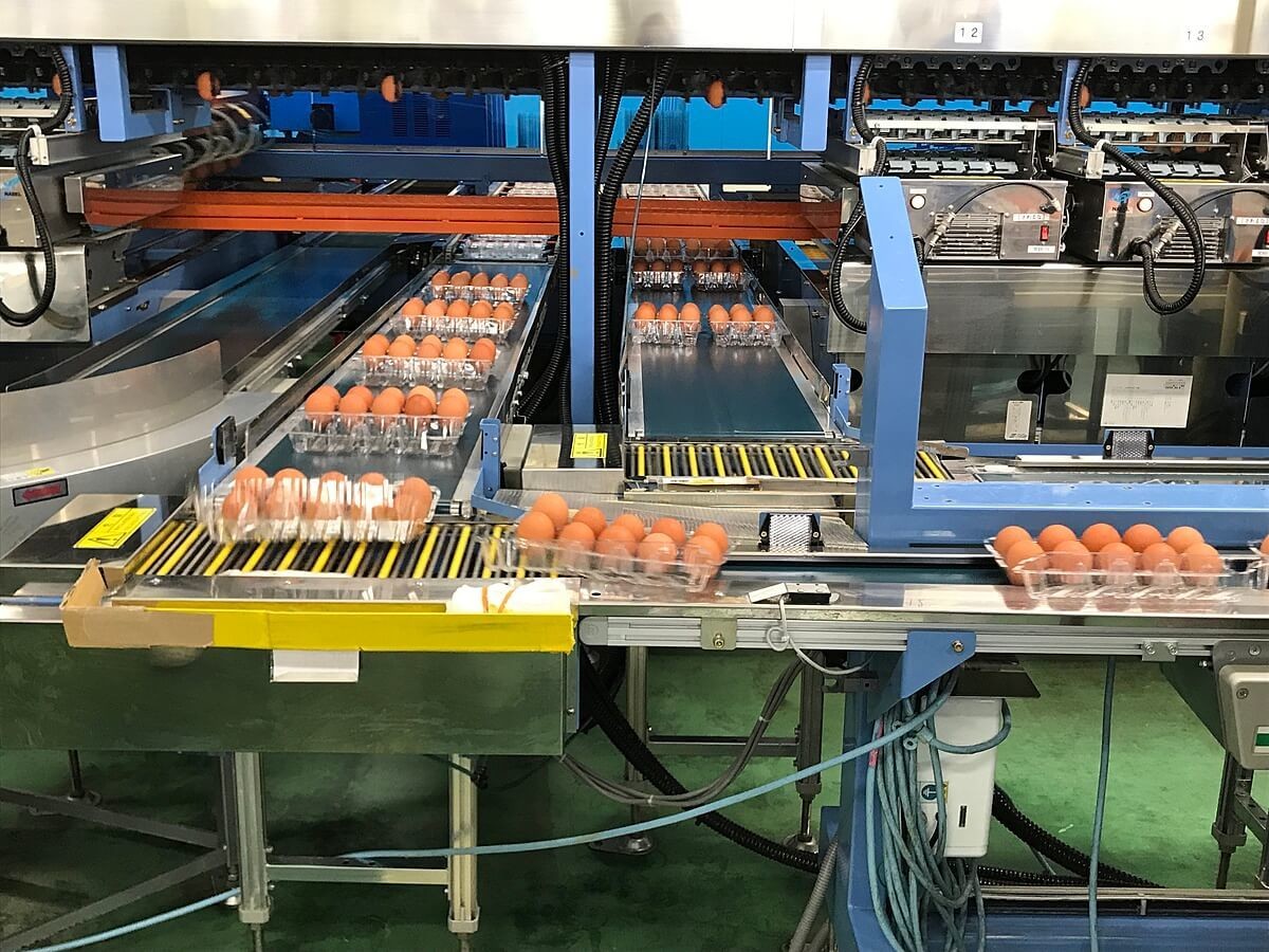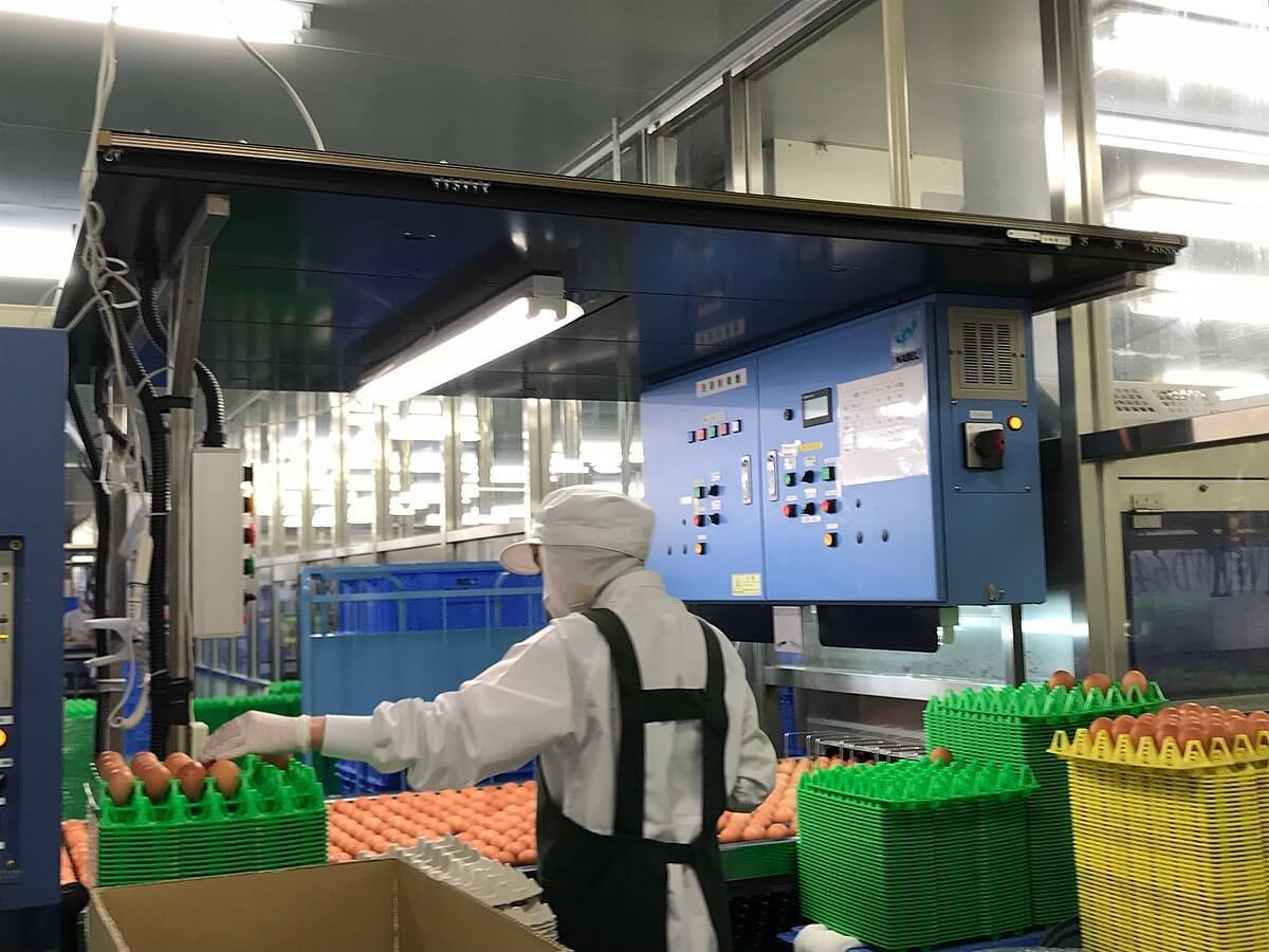 卵が到着すると、洗卵を行い、厳格な検品を経てパック詰めのコンベアに乗る流れです。