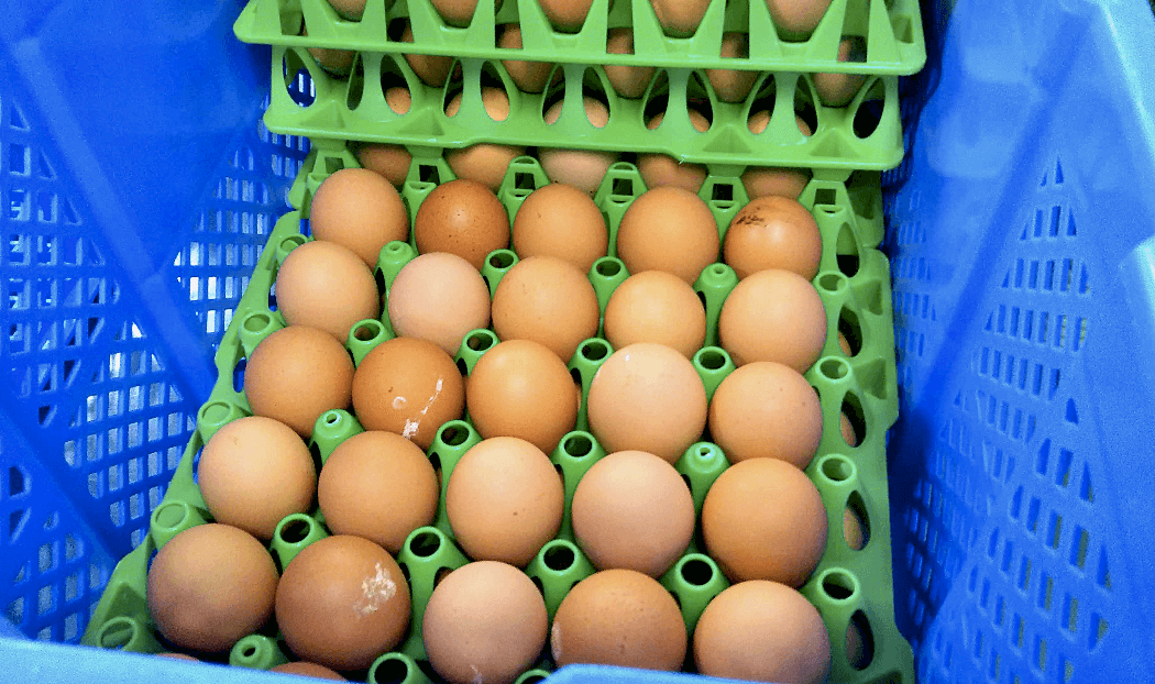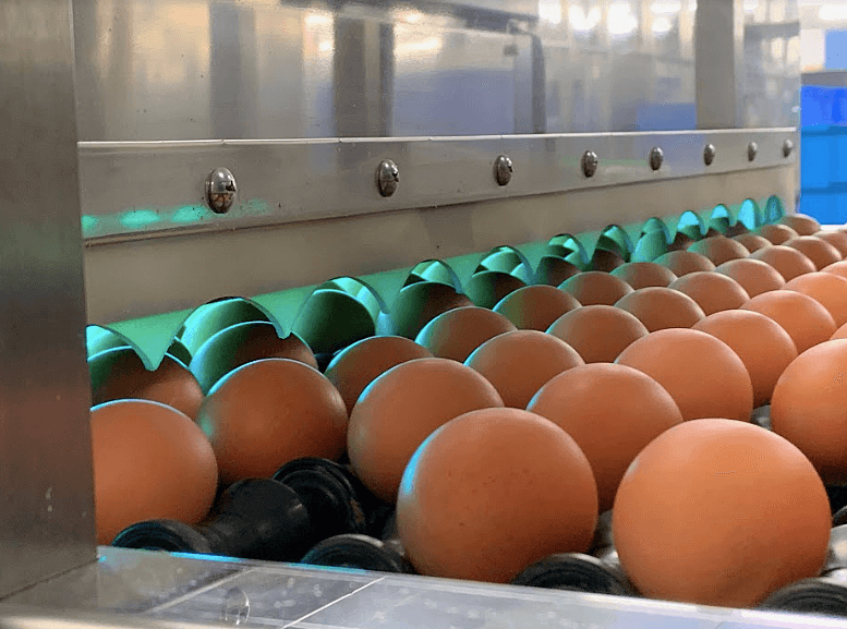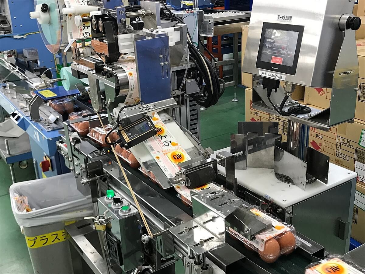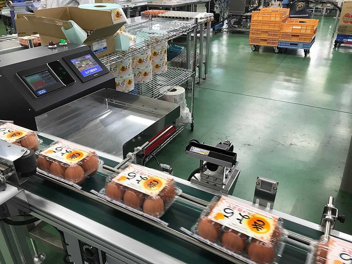 卵が到着すると、洗卵を行い、厳格な検品を経てパック詰めのコンベアに乗る流れです。