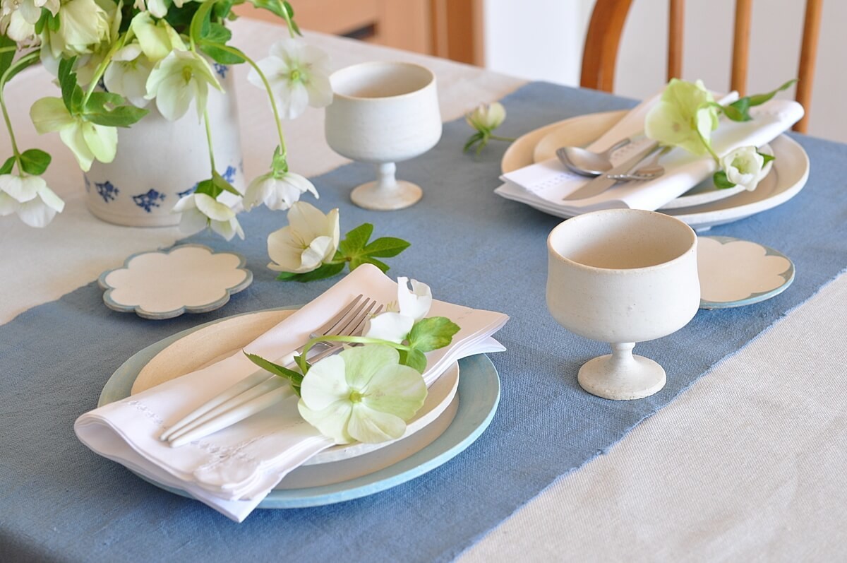 白い大きなリネンのテーブルクロスにブルーのセンタークロスでアクセントをつけました。何色も使うと、まとめるのに難しいので初めは2~3色にするのがオススメです。