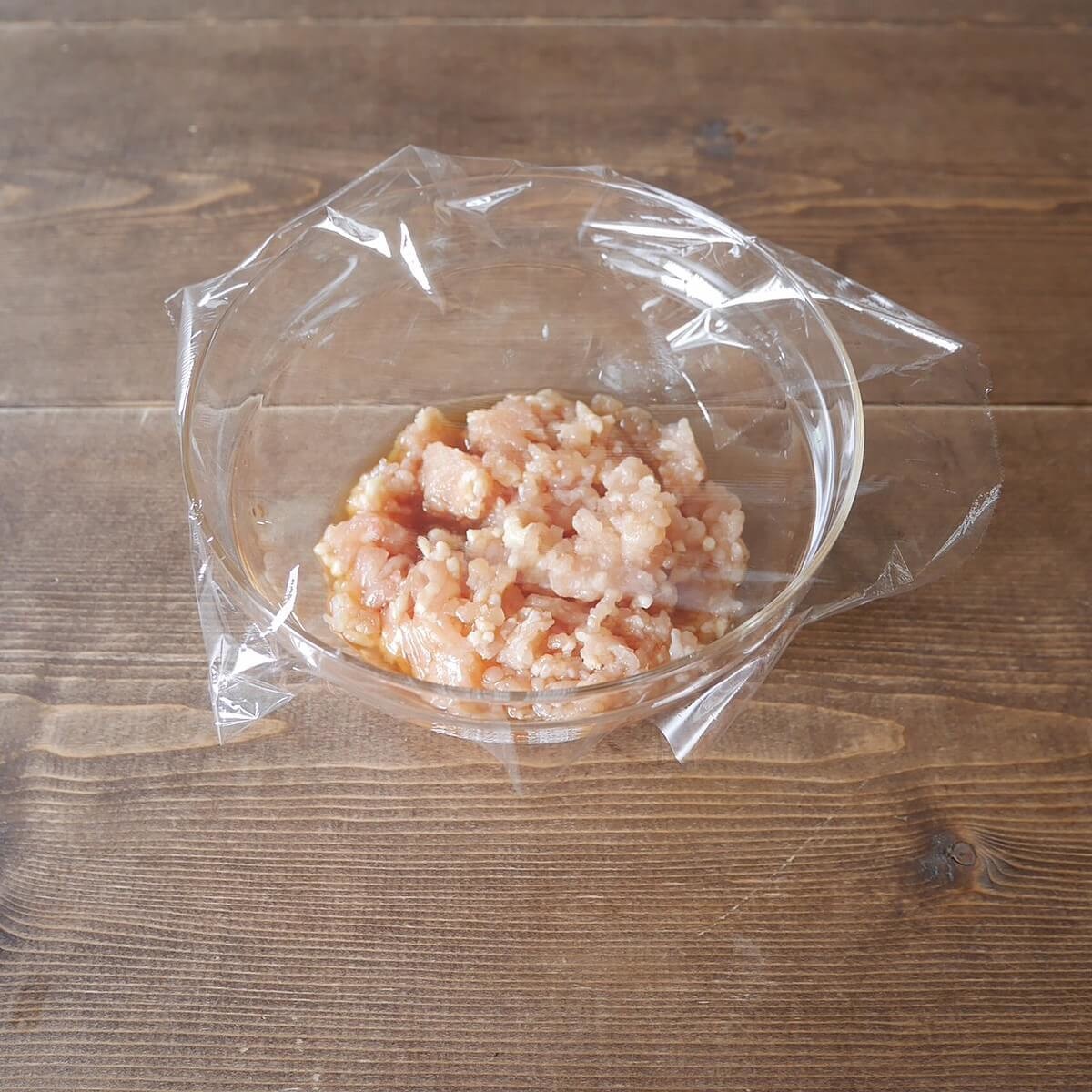鶏ひき肉と調味料全てを耐熱ボウルに入れ、菜箸や泡立て器で混ぜ合わせます。