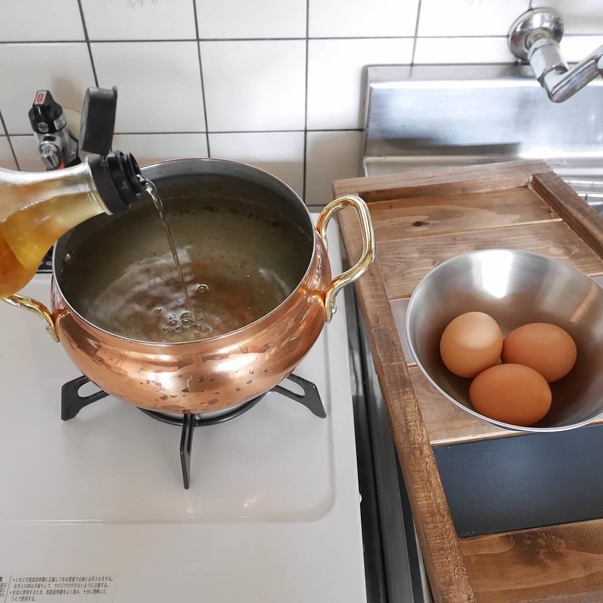 卵は冷蔵庫から出して常温に戻しておき、お鍋で湯を沸かします。