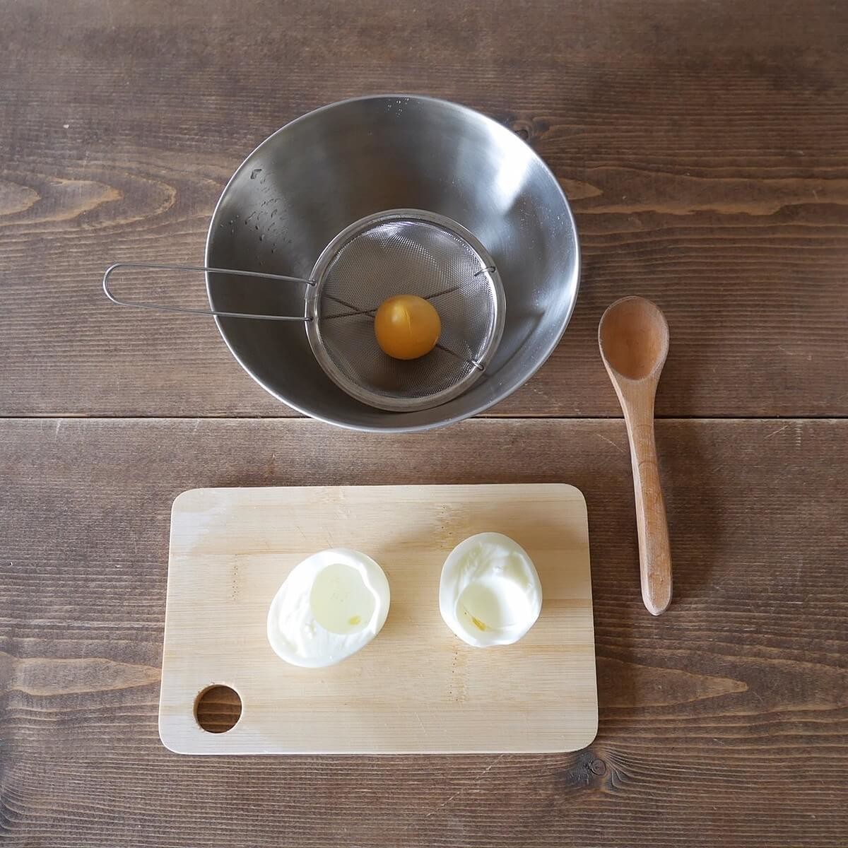 黄身を茶漉しや目の細かいザルに入れ、スプーンなどで押し当てながら濾します。