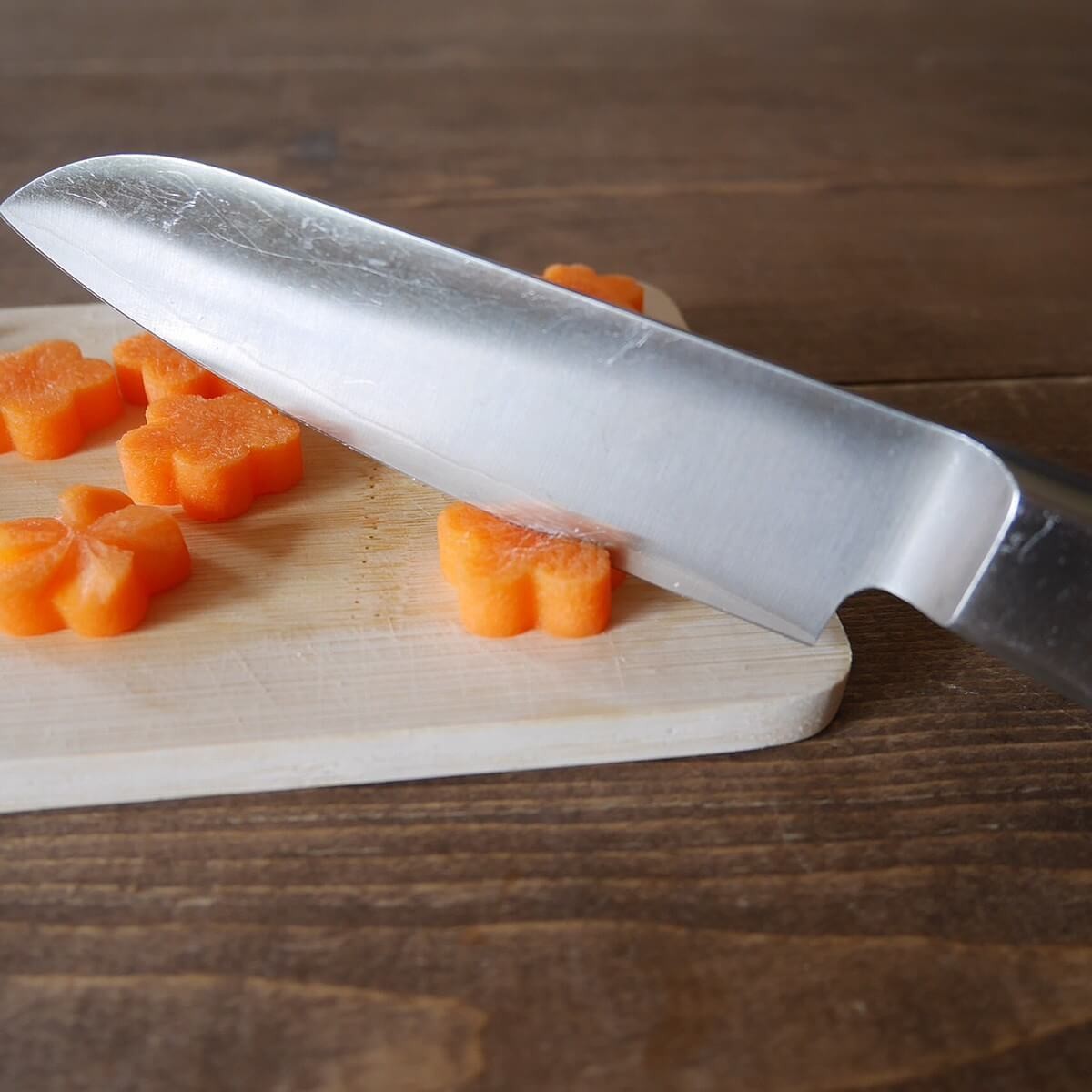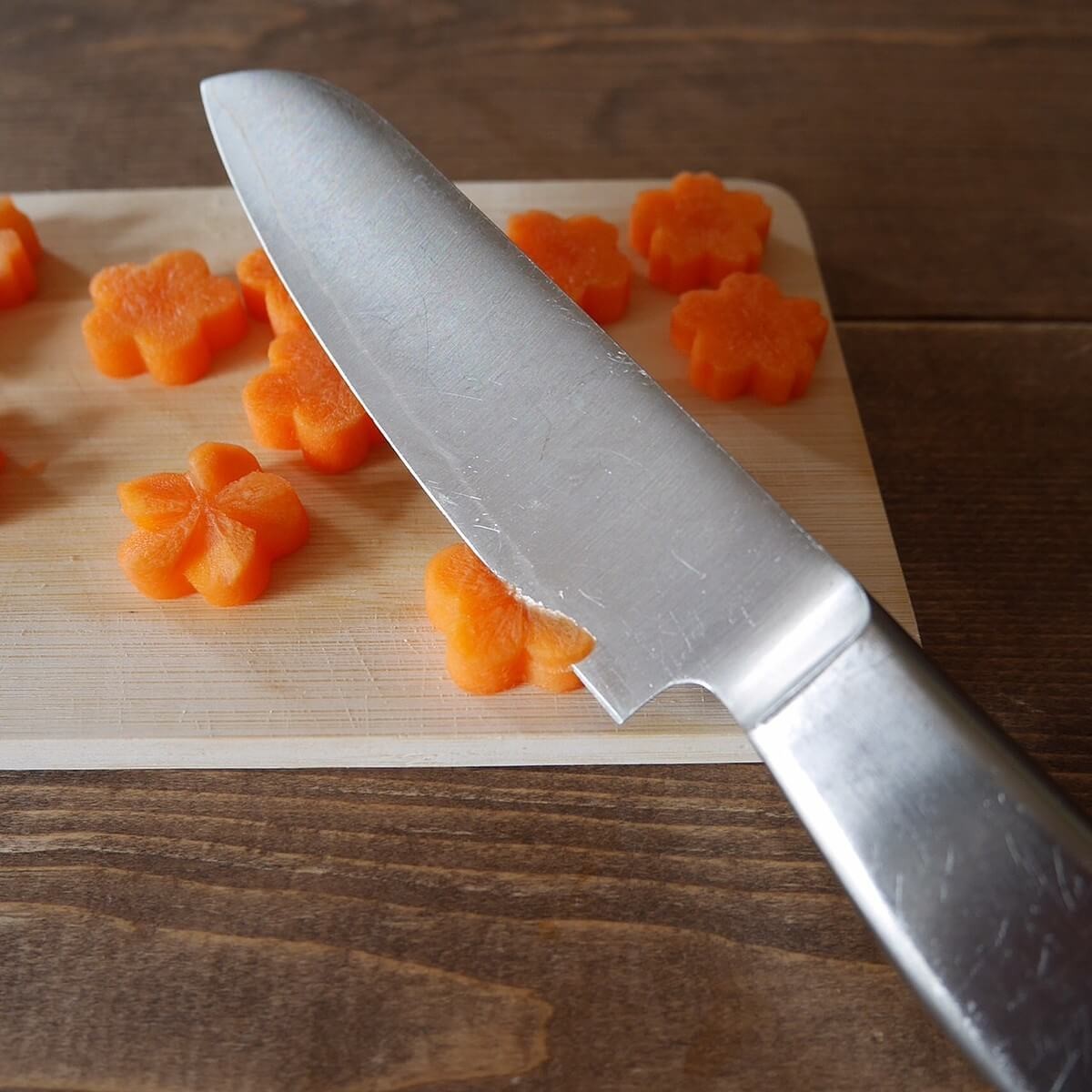 花びらの繋ぎ目から中心に向かって、人参の厚みの半分程度包丁を入れ