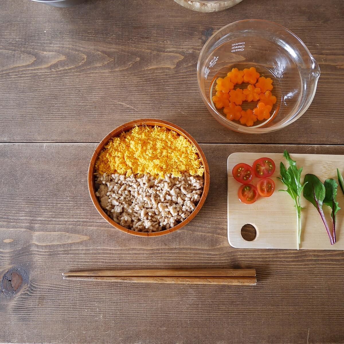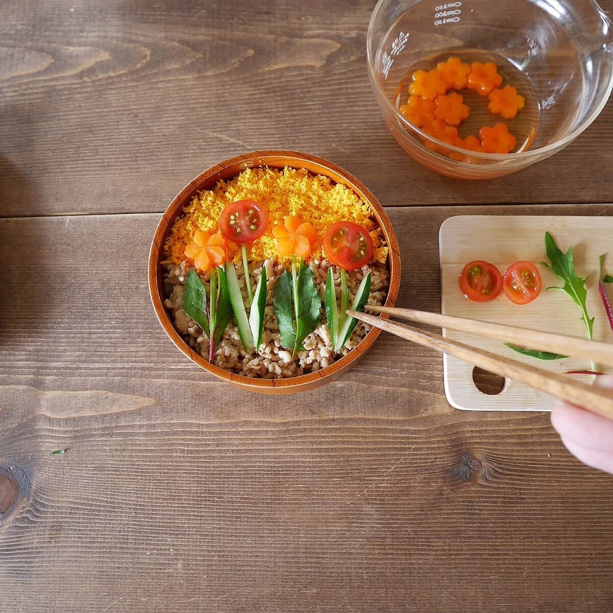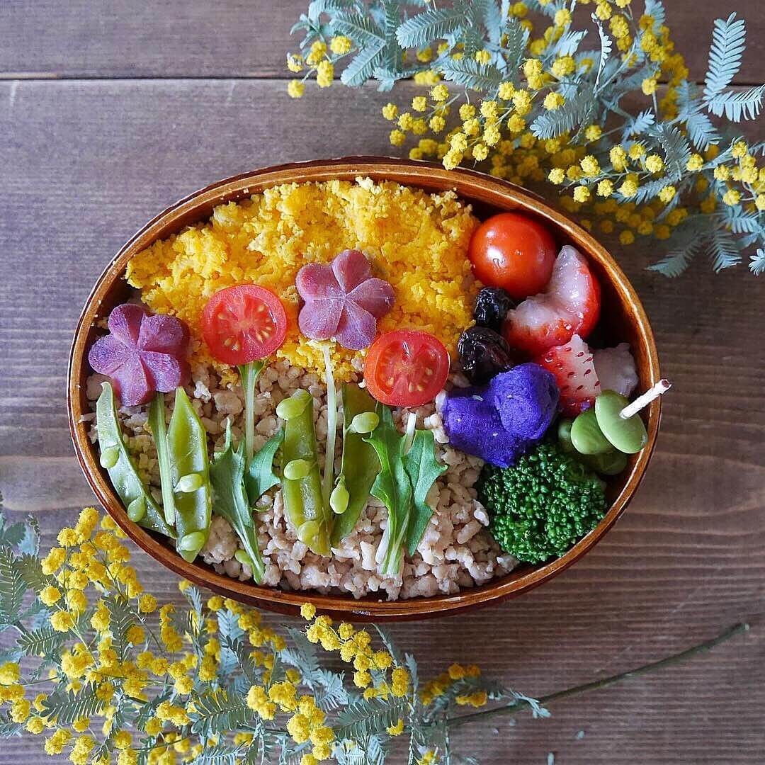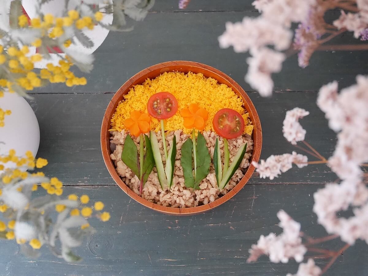 お花見などお出掛けの機会が増えるこの季節、鶏そぼろと卵の2色弁当にお花を飾って、春爛漫お花弁当を作りました。