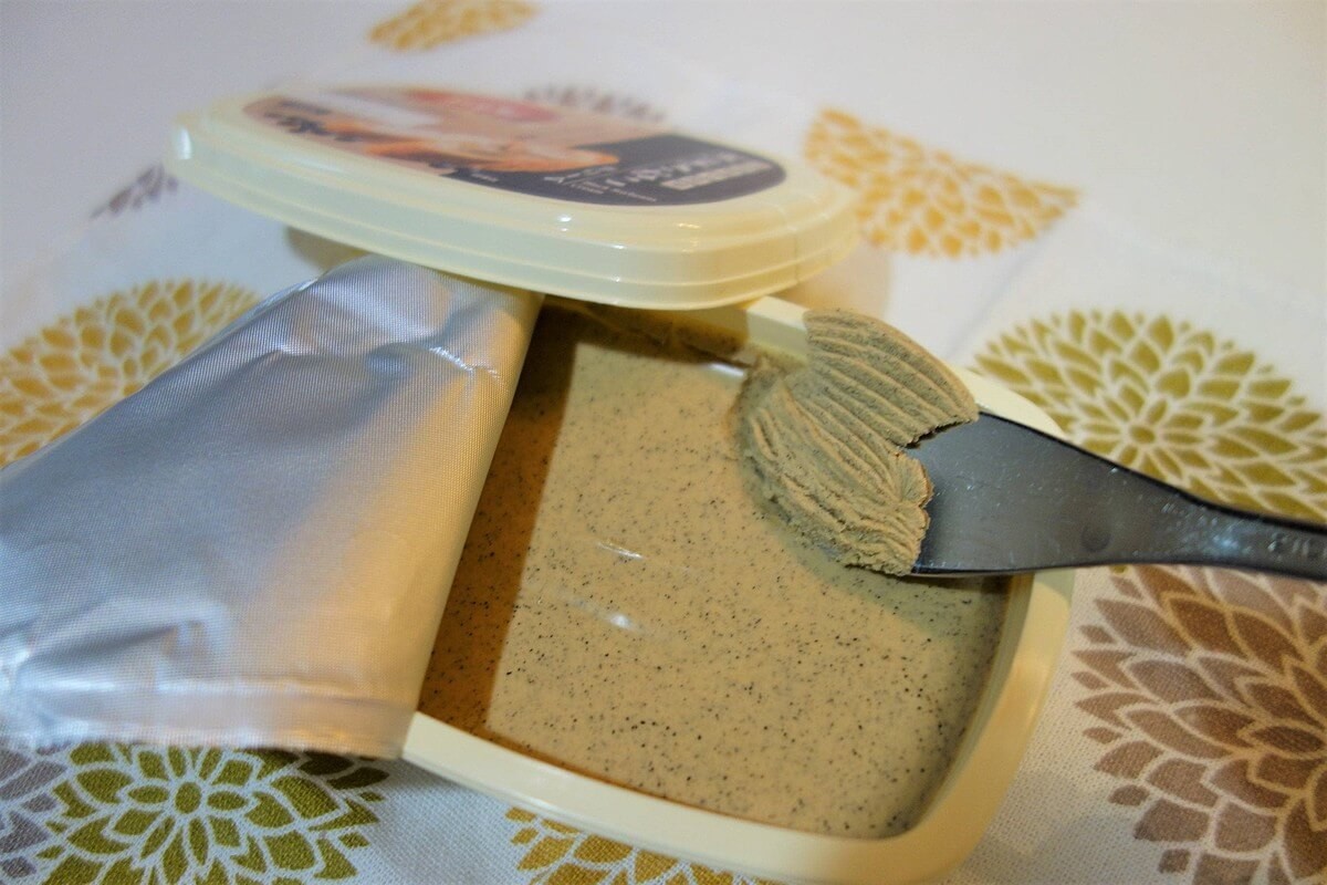 クリームはなめらかでパンに塗りやすく、焼いた食パンに付けると、トロっと溶けます。 よく見ると、黒豆のつぶつぶが入っているのが分かります。