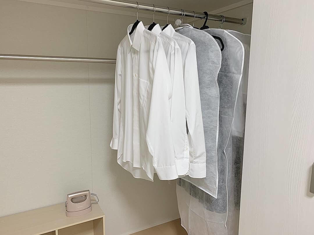 シャツ類は、洗濯後にまとめてクローゼットにかけています。この衣類スチーマーは、ハンガーにかけたまま使えるから、使う場所はもっぱらクローゼット前。コンパクトなフォルムで、クローゼット内の棚に置いています。コードの長さも十分にあって、ここで立ったまま使うことができるのが本当に楽です。(@chiii__homeさん)
