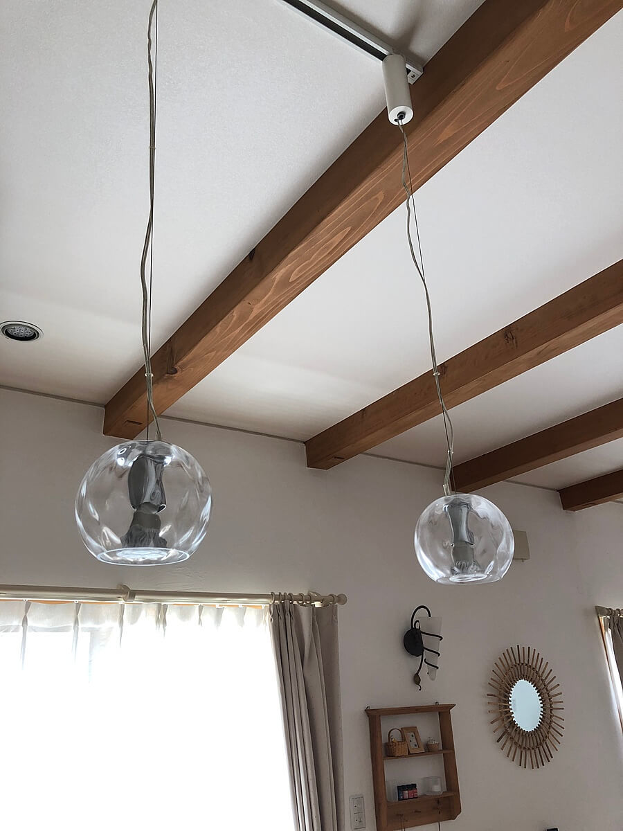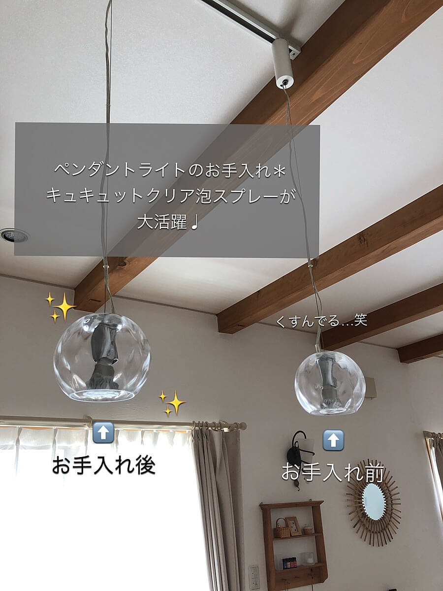 うちの球状のペンダントライトも、少し前からキュキュットクリア泡スプレーでお手入れしています。