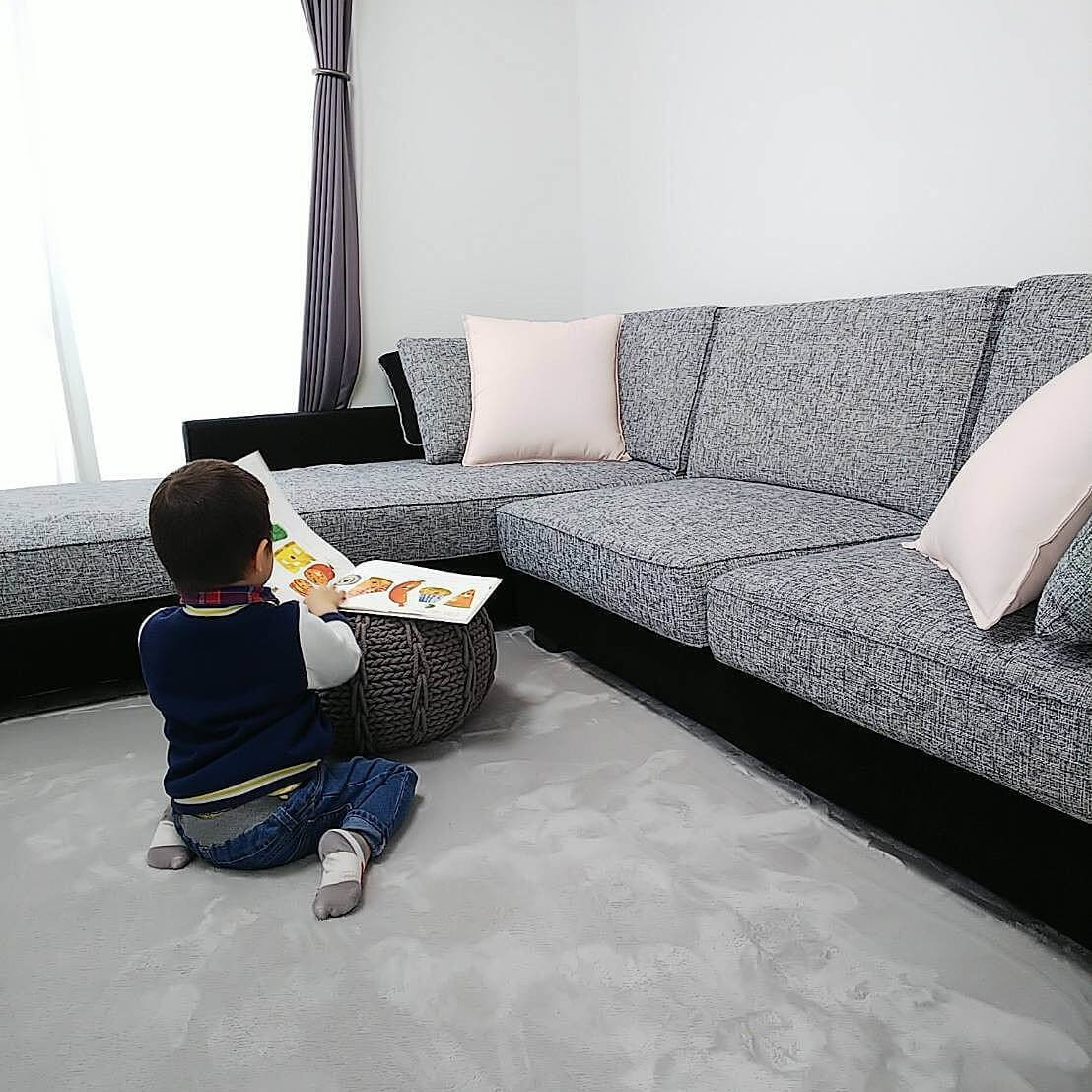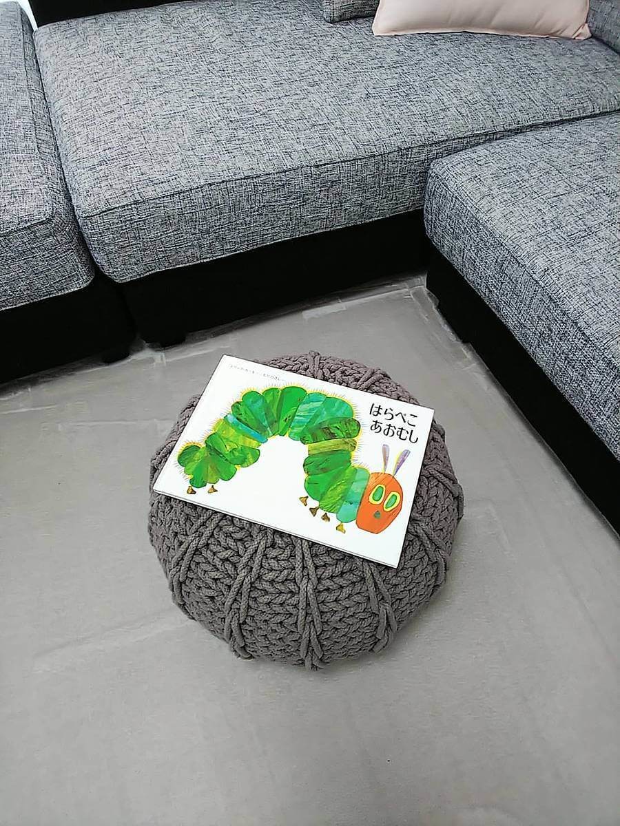 このニットプフは子どもが床に座るとちょうど机のような程よい高さになるので、子ども達にとっても使いやすいアイテムになっています。