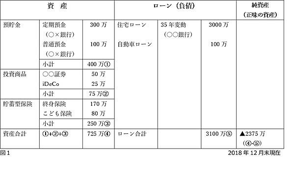 これは、年間支出表と同じノートに、逆ページから半年に一回作成し、現状の資産(貯金や投資の時価額、保険の解約返戻金)と借金(住宅ローンなど)、それを差し引きした純粋な資産がどれ位あるのかをチェックしています(図1)。
