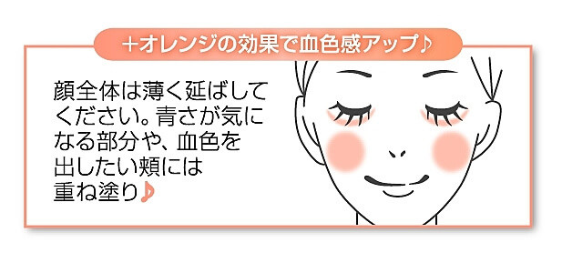 今回の新色「オレンジ系」は、補色としてパソコンやスマートフォンによる目の酷使・睡眠不足による血行不良でできる青クマを徹底的にカバーし、血色感をプラスします。