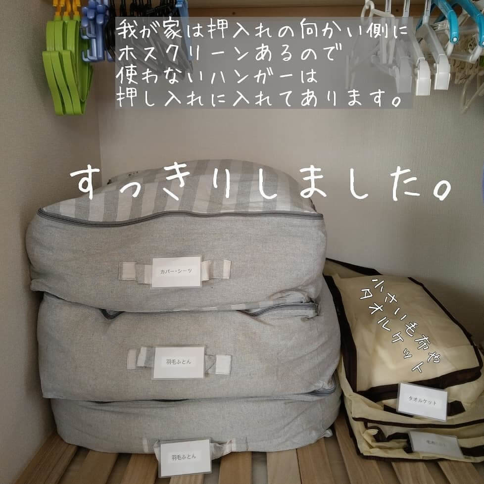立てて、クローゼットの上部に布団を収納しているため、使うときは取り出しやすい収納になっています。ピンチラベルで何が入っているのかを書いてあるのも分かりやすいですよね。