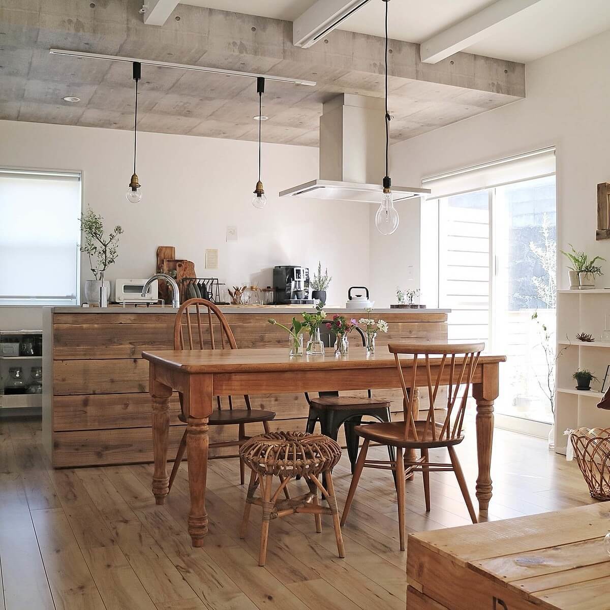 温かみのある木のダイニングテーブルに色々な椅子を配置してカフェのような雰囲気に。