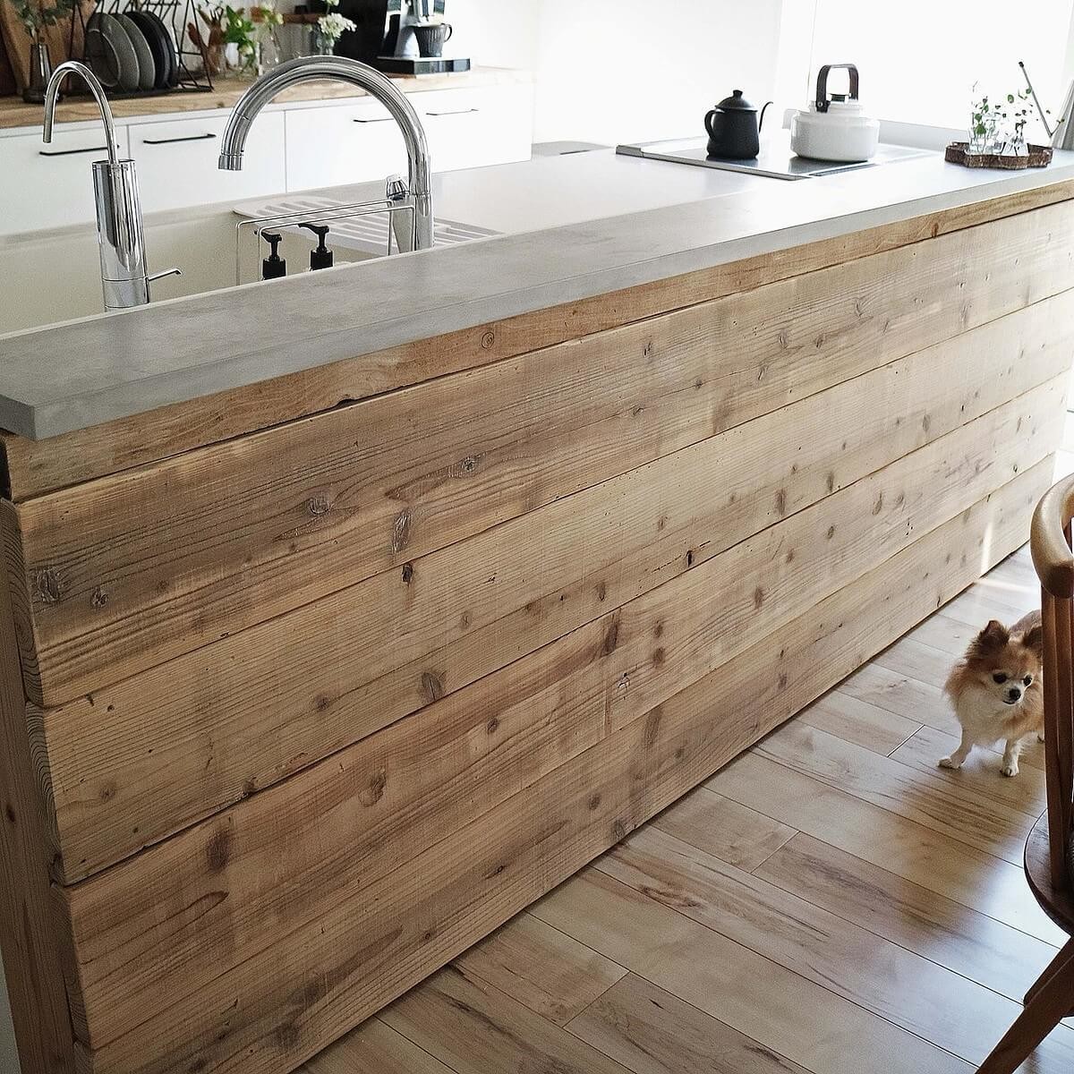 キッチンカウンターは、お家を建てた時に大工さんにお願いして下地だけ作ってもらい、自分で古材を前面に貼り、天板は木材をペイントしてコンクリートに見立ててます。