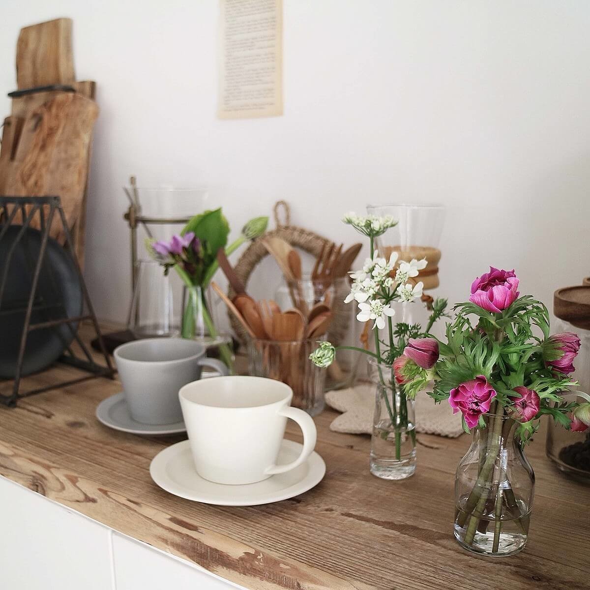 キッチンは生活感が出やすい場所。まずはカウンター上や棚など小さな空間から始めてみては。カフェっぽい雰囲気を作っておうち時間を楽しんでください。